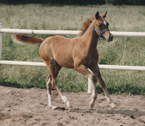 1993 schenkte Citty uns ein Hengstfohlen, Dusty, von Ramak - ein Kind der Liebe. Mit dem Abfohlen wartete sie auf uns - wir hielten draussen vor der Boxentür im Auto Fohlenwache, schliesslich wollten wir sie nicht stören. Lautes Rumoren und Schlagen gegen die Boxenwand alarmierten uns - wir betraten den Stall, kassierten einen empörten Blick von Citty - "Wo bleibt ihr denn - warum hat das so lange gedauert!? Ich will endlich anfangen!!" - und schon legte sie sich ins Stroh und brachte innerhalb von 20 Minuten ein Hengstchen zur Welt. Wir waren dann dazu abgestellt, den Kleinen mit Stroh trockenzureiben - Citty hatte dazu keine Zeit, sie hatte Hunger und verdrückte erstmal eine 5kg-Portion Hafer. Dusty war ein perfektes Fohlen, mit kerzengeraden Beinen, feinem Araberkopf und Cittys Bemuskelung (wenn auch etwas weniger).